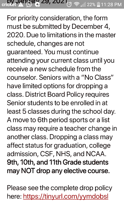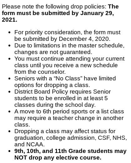 Please note the following drop policies: <strong>The form must be submitted by January 29, 2021.</strong>