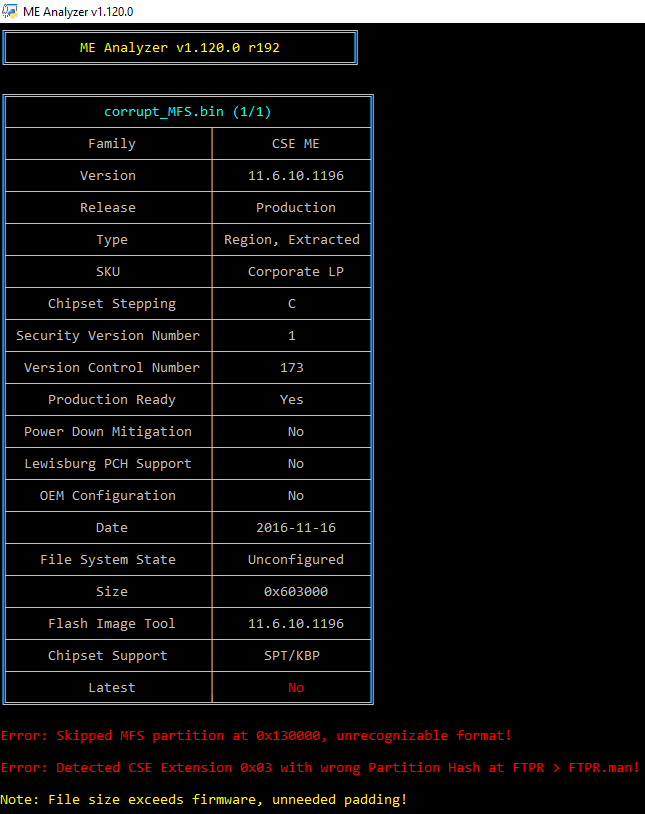 During operation, ME Analyzer may encounter issues that can trigger Notes, Warnings and/or Errors. Notes (yellow/green color) provide useful information about a characteristic of this particular firmware. Warnings (purple color) notify the user of possible problems that can cause system instability. Errors (red color) are shown when something unexpected or problematic is encountered.