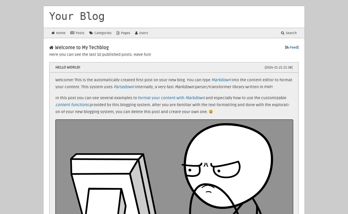 Easy blogging application written with pure PHP7! The application comes with a fulltext search functionality for posts and with customizable templates and languages. You can build your own template if the standard template does not satisfy you! You can see the application in action with a custom template on my private blog at blog.nerdmind.de!