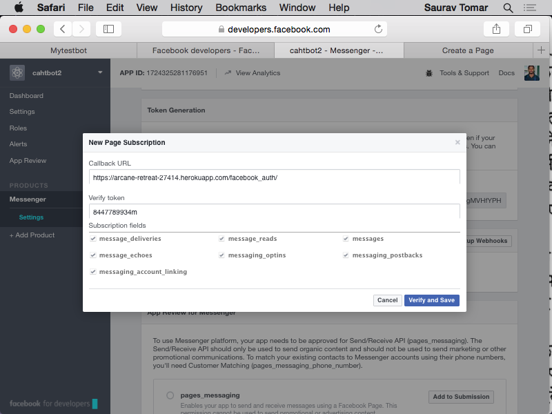 Every messenger bot must be associated with a facebook page, Add your page access token to this line