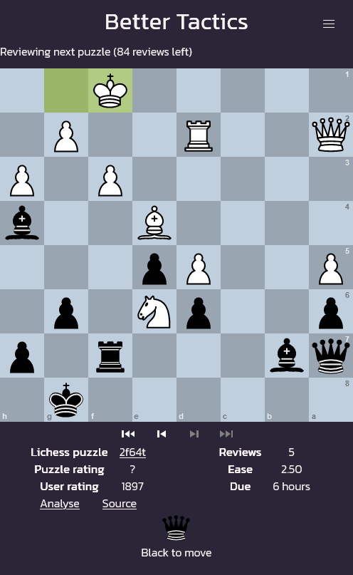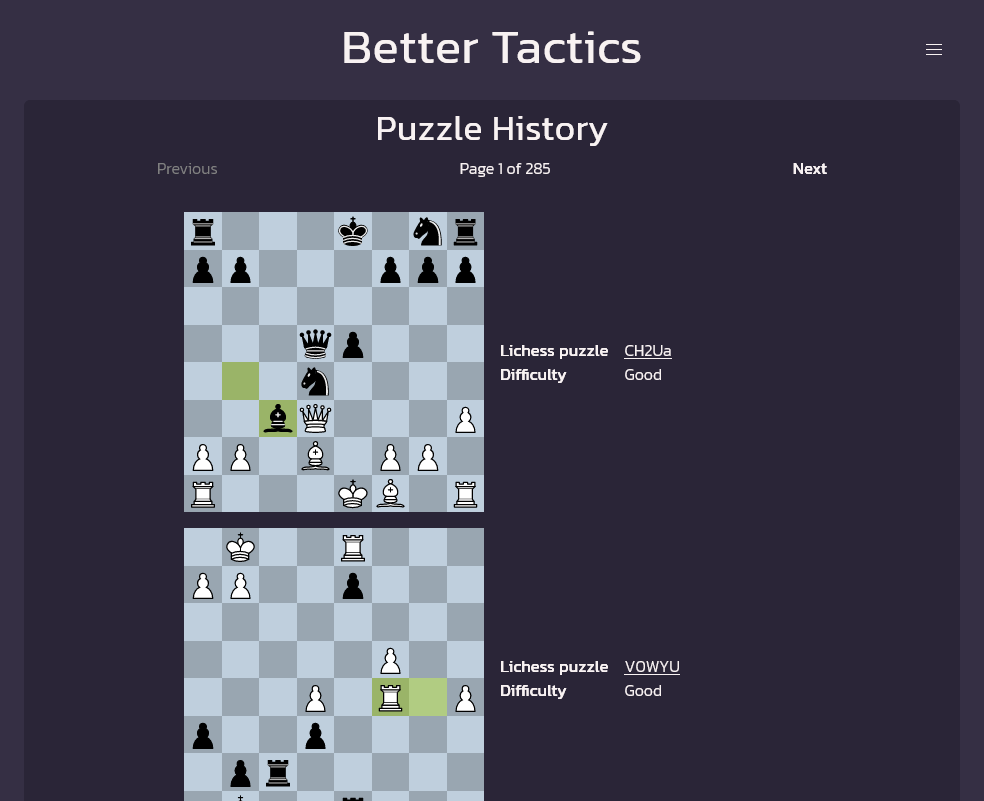 Better Tactics is a Chess tactics trainer that uses the concept of Spaced Repetition to help you master chess tactics. The idea is to help you improve your tactical pattern recognition and gain experience calcualting tactics, by repeating puzzles you've seen previously over time. Puzzles you complete will get queued up for review daily, and puzzles you find hard will be repeated more frequently, while puzzles you find easy will be repeated far less often to make the process more efficient.
