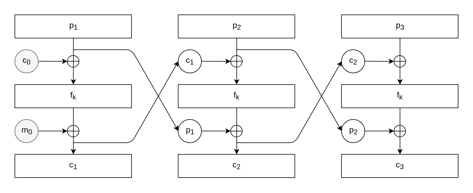 c_i = f_k(p_i ^ c_{i-1}) ^ p_{i-1}