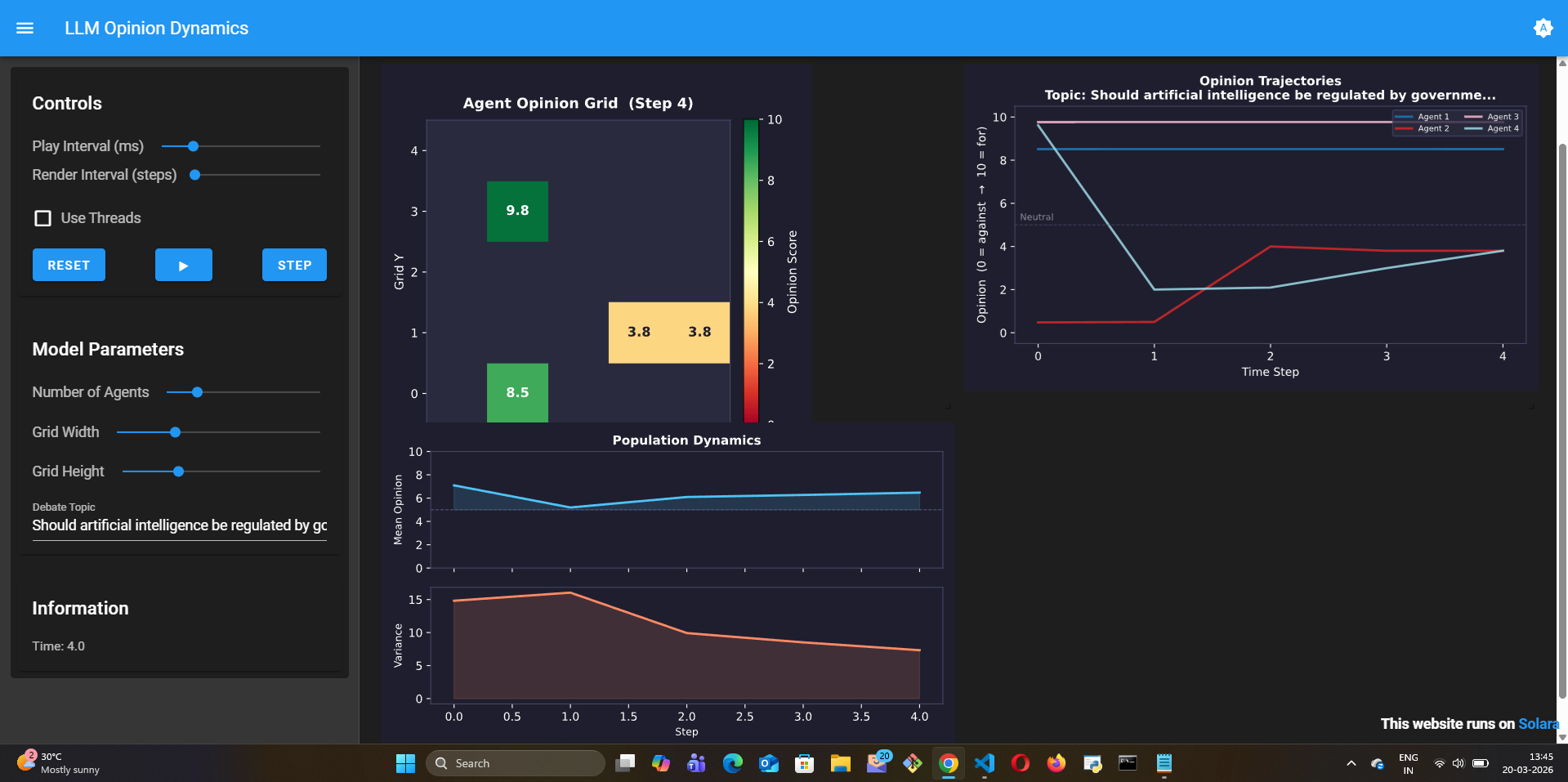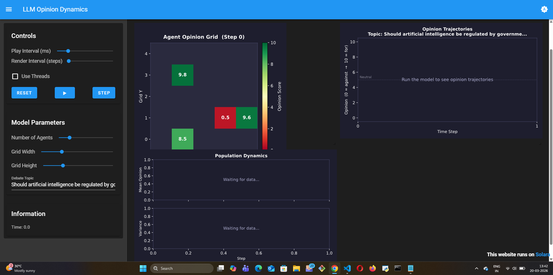 agent.py—OpinionAgentextendingLLMAgentwith CoT reasoningmodel.py—LLMOpinionDynamicsModelon anOrthogonalMooreGridapp.py— SolaraViz with opinion heatmap, trajectory lines, and population dynamicsREADME.md— explanation with comparison table vs Deffuant-WeisbuchHow it works