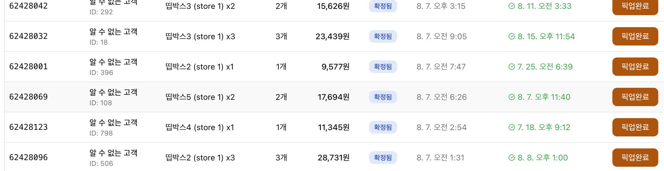 - 주문번호, 고객 ID, 상품명, 수량, 금액, 주문일시, 픽업시간 조회